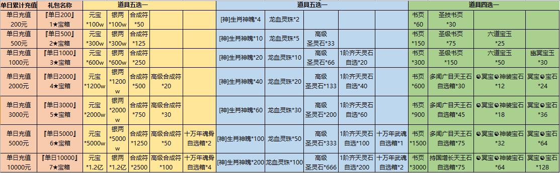 单日真实金额组合申请例举:A玩家8月10日真实充值1024,可选择申请『单日1000』3★宝箱*1 或 选择 『单日500』2★宝箱*1+『单日200』1★宝箱*2,以此类推。