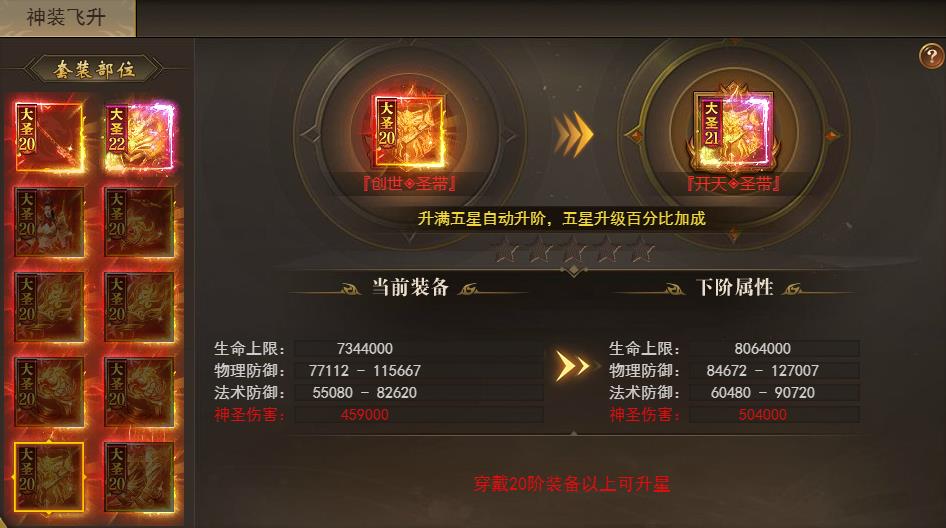 大圣飞升是大圣神装等阶拓展系统,每升五星自动升阶,获取大量属性!