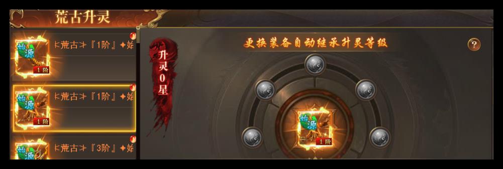穿戴荒古装备后,消耗荒古精血、荒古精魄可对荒古装备进行升灵,获得大量基础属性和泯灭伤害,升灵至一定星级后还可获得对应槽位装备基础属性加成。