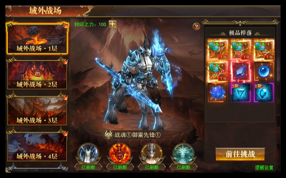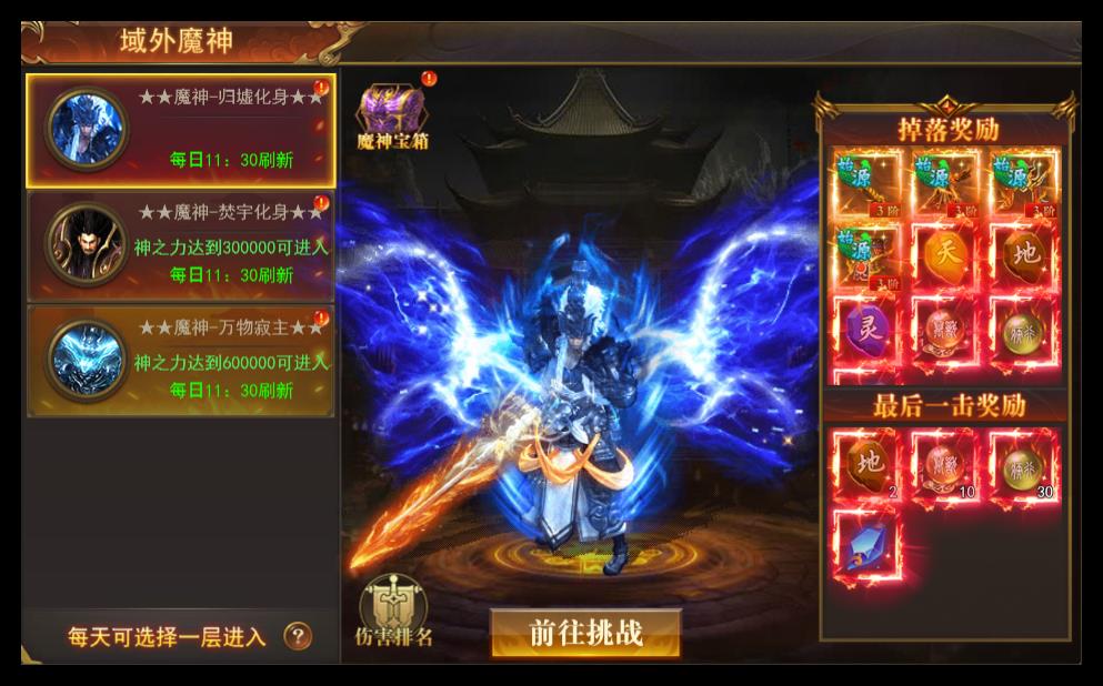 每日11:30魔神降临域外,每层BOSS独立计算奖励,玩家可选其中一层参与(每日仅可选一层进入,前往挑战后无法更改)。
