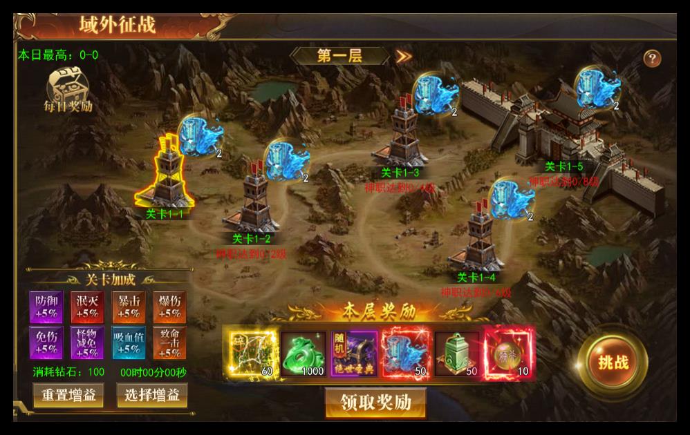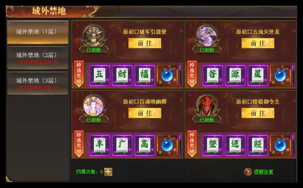 跨服副本地图,不同层数所需神之力和荒古装备等阶不同,层数越高,奖励越好。
