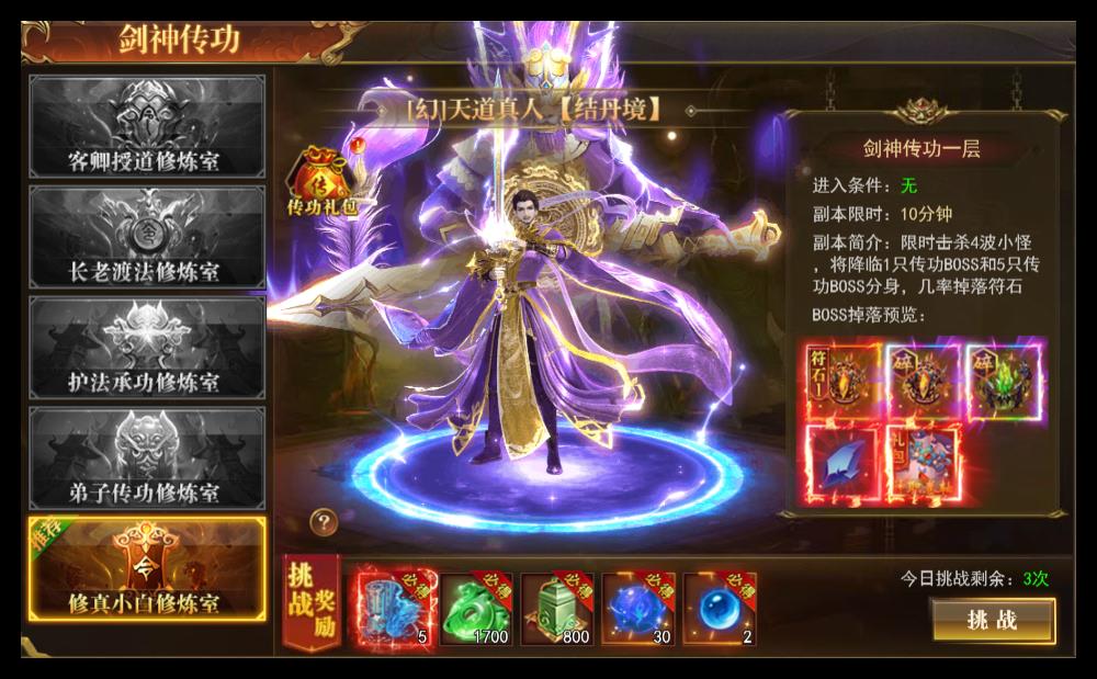 个人副本,通过激活传功令牌可进入不同的修炼室,修炼室越高级,奖励越好。