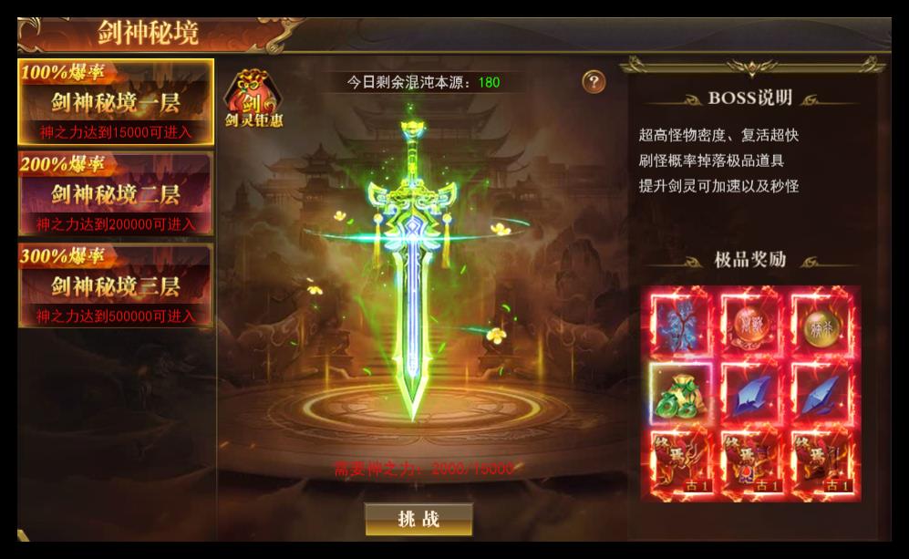 个人副本,共3层,达到指定的神之力可进入,层数越高,奖励越好。